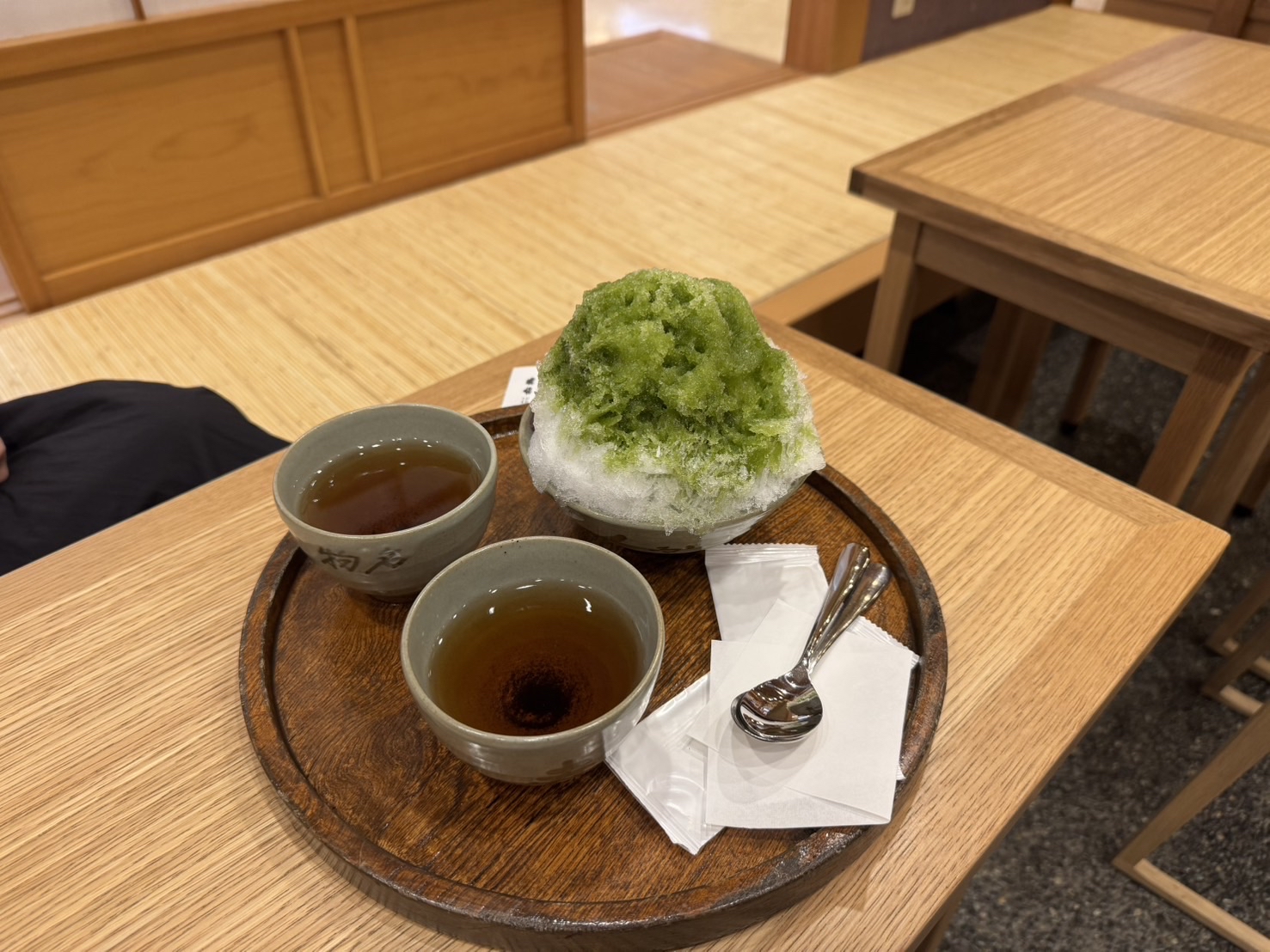 夏の終わり、ふと立ち寄った和の空間でいただいた冷たいかき氷と温かいお茶。